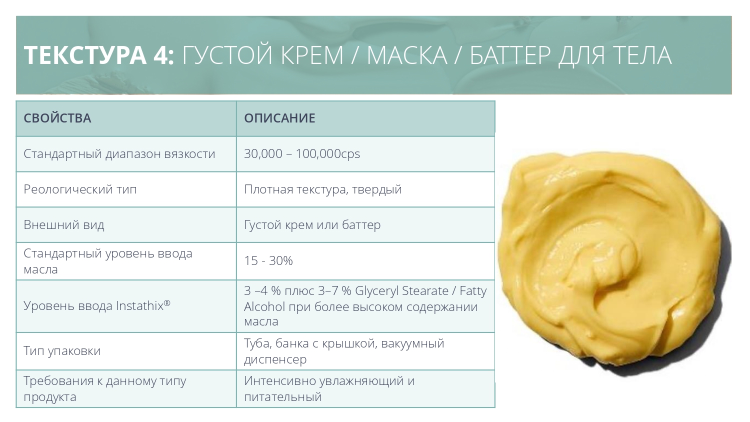 • Сатиновый матовый внешний вид, имитирующий ощущение силиконового эластомера – может заменить синтетические эмульгаторы / полимеры